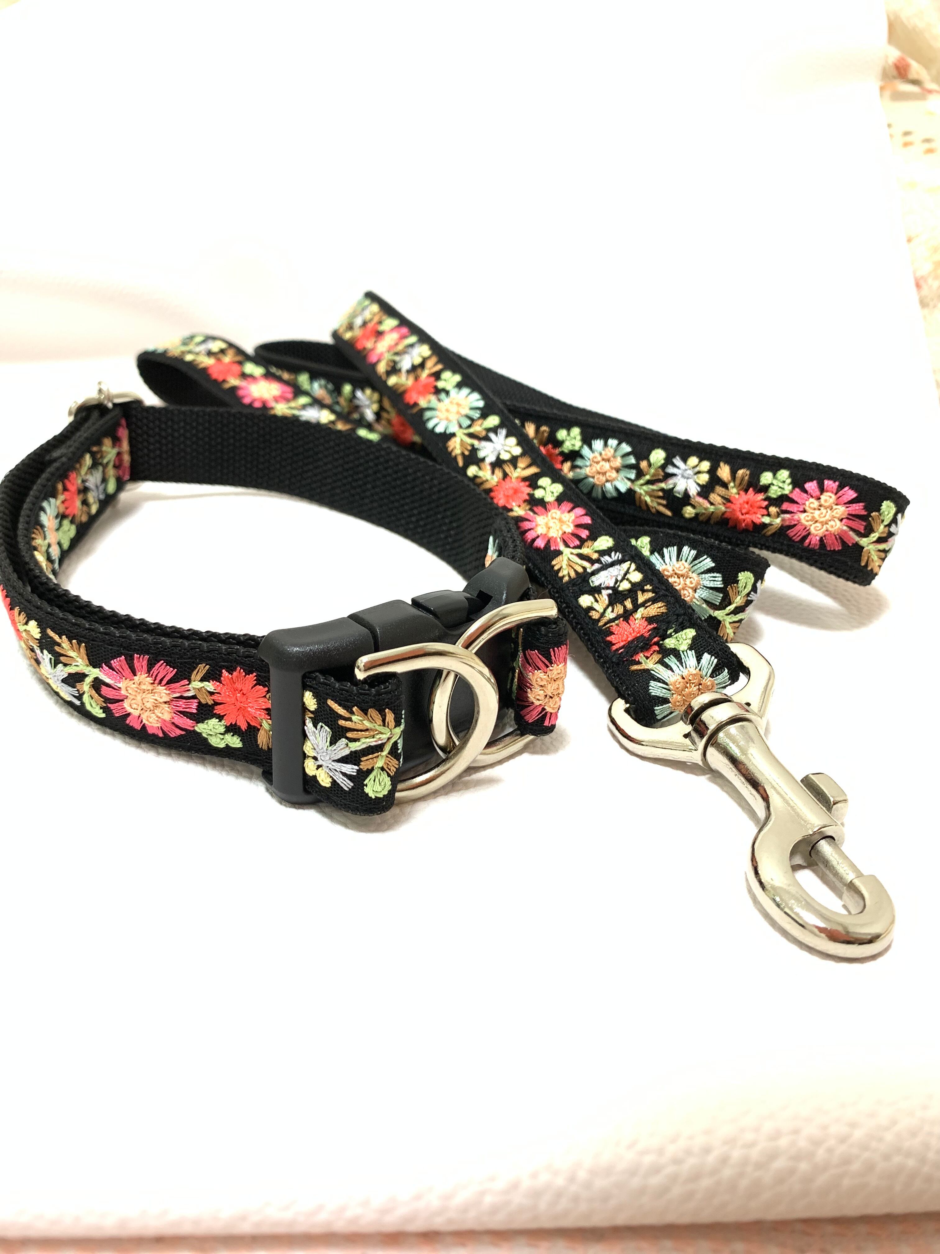 少し太めのテープの余白を調整し 幅いっぱいまでお花刺繍の 可愛い首輪が出来上がりました♡ ✼••┈┈┈┈••✼••┈┈┈┈••✼ こちらは小さいワンちゃんのための シングルDカン仕様です! ★サイズ /幅2.5cm 首周り約25〜34cm ☆使っているリングは、繋ぎ目がなく強度の高いものを使っています。 ☆ベースは、強度のあるPPテープです。 ✼••┈┈┈┈••✼••┈┈┈┈••✼ 【購入前に必ずご確認お願い致します。】 ⚫︎ハンドメイド品にご理解のある方のみご購入お願いします。 ⚫︎カラー(首輪)は、消耗品です。ご使用前には必ず点検してからお使いください。 ⚫︎リボンは点検しておりますが、海外製品のため刺繍のトビホツレ、プリントのズレカスレがある場合もございます。 ⚫︎インド刺繍テープの中には匂いがあるものもございます。気になる場合は、数日陰干ししていただいてからご使用ください。 ⚫︎モニターの環境により実際の色と違って見える場合があります。 ⚫︎万が一の事故などにつきましては保証や責任等は負いかねますのでご了承ください。